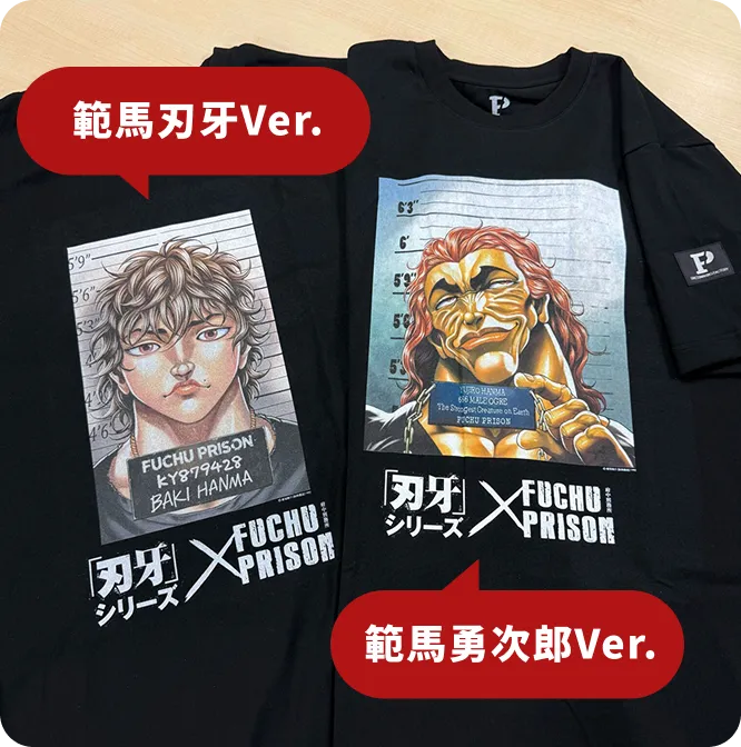 後援いただいている府中市ゆかりの漫画家・板垣恵介先生の人気漫画「刃牙」シリーズと府中刑務所とのコラボTシャツ。「刃牙」シリーズ×府中刑務所コラボTシャツ 範馬刃牙Ver.と範馬勇次郎Ver.の2パターン、3部門各1着の計6着を提供いただきました。